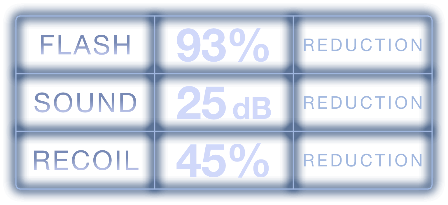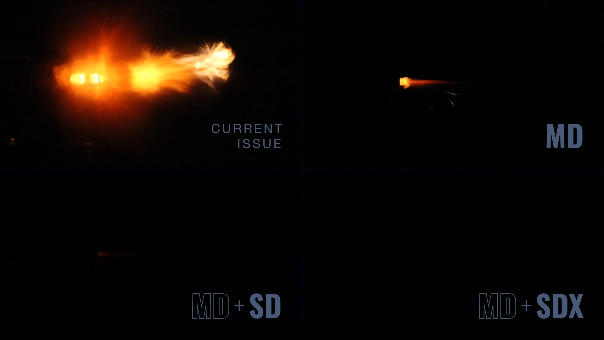 Comparing the visual flash signature of the current issued flash hider versus the MFMD-.264-1.2 system in each available configuration: MD only, MD+SD, and MD+SDX.
