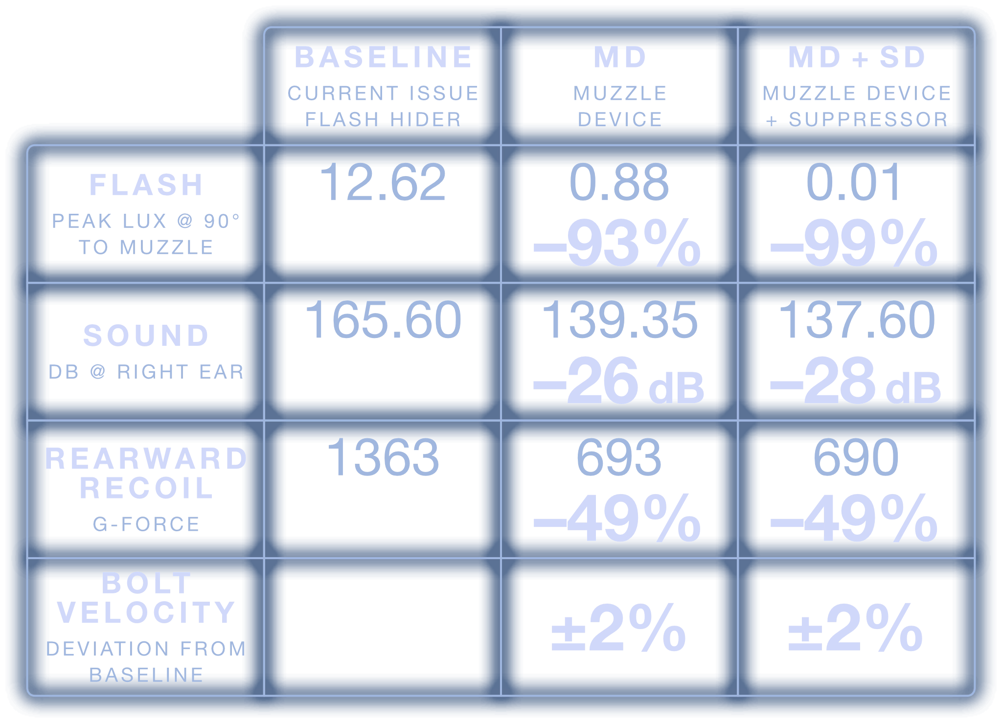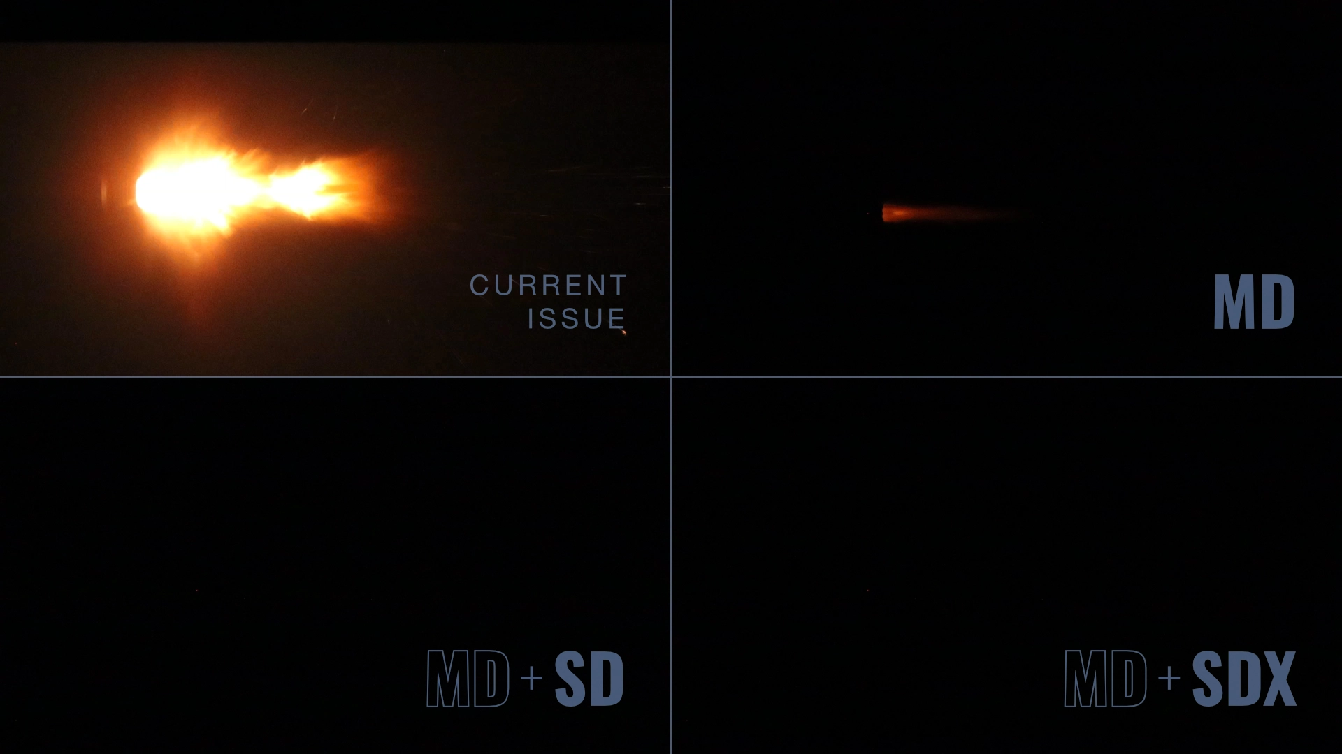 Comparing the visual flash signature of the current issued flash hider versus the MFMD-.300-4.0-MD-3/4X24 system in each available configuration: MD only, MD+SD, and MD+SDX.