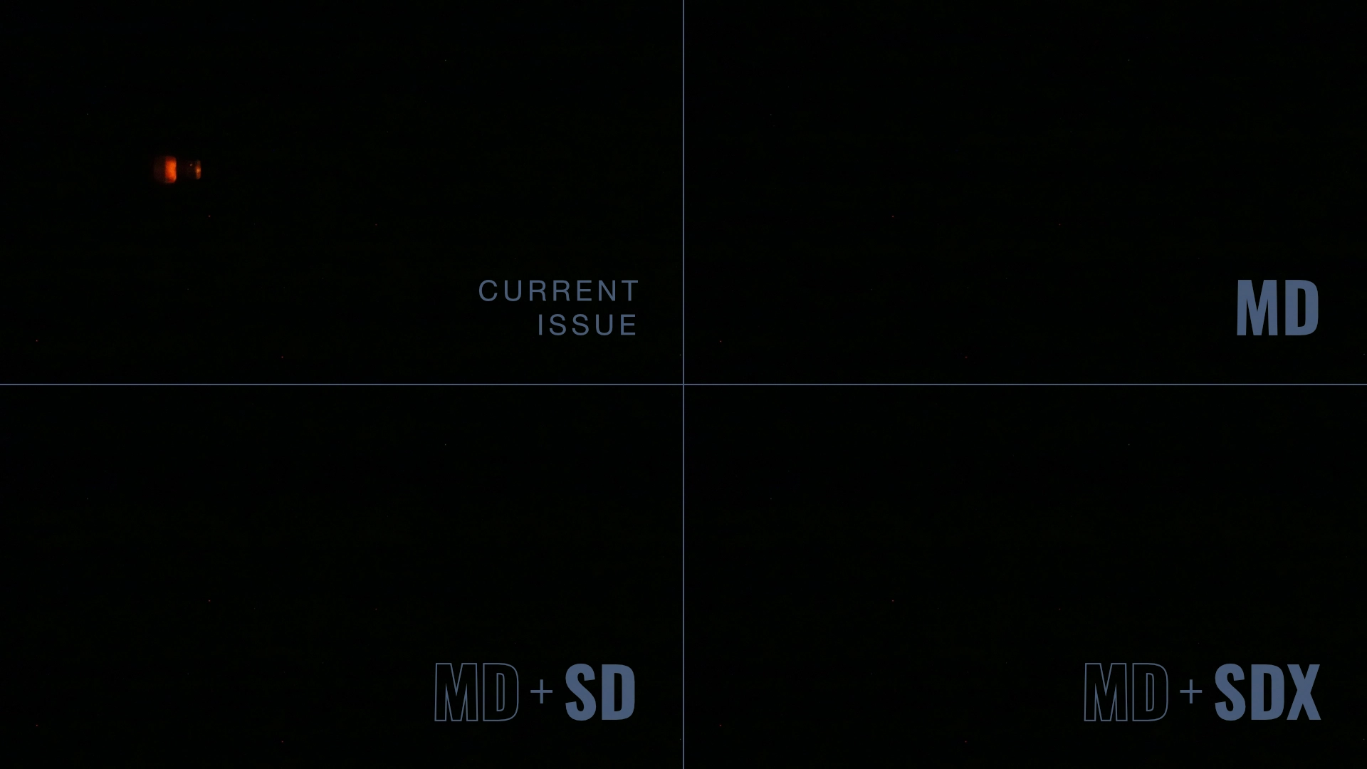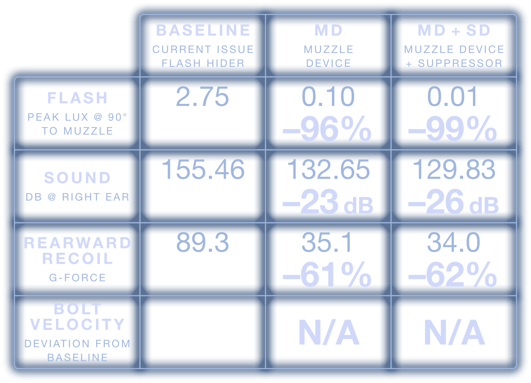 Comparing the visual flash signature of the current issued flash hider versus the MFMD-.375-3.2-MD-3/4X24 system in each available configuration: MD only, MD+SD, and MD+SDX.