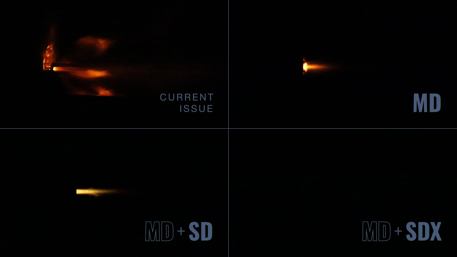 Comparing the visual flash signature of the current issued flash hider versus the MFMD-5.56-0.0-MD-1/2X28 system in each available configuration: MD only, MD+SD, and MD+SDX.