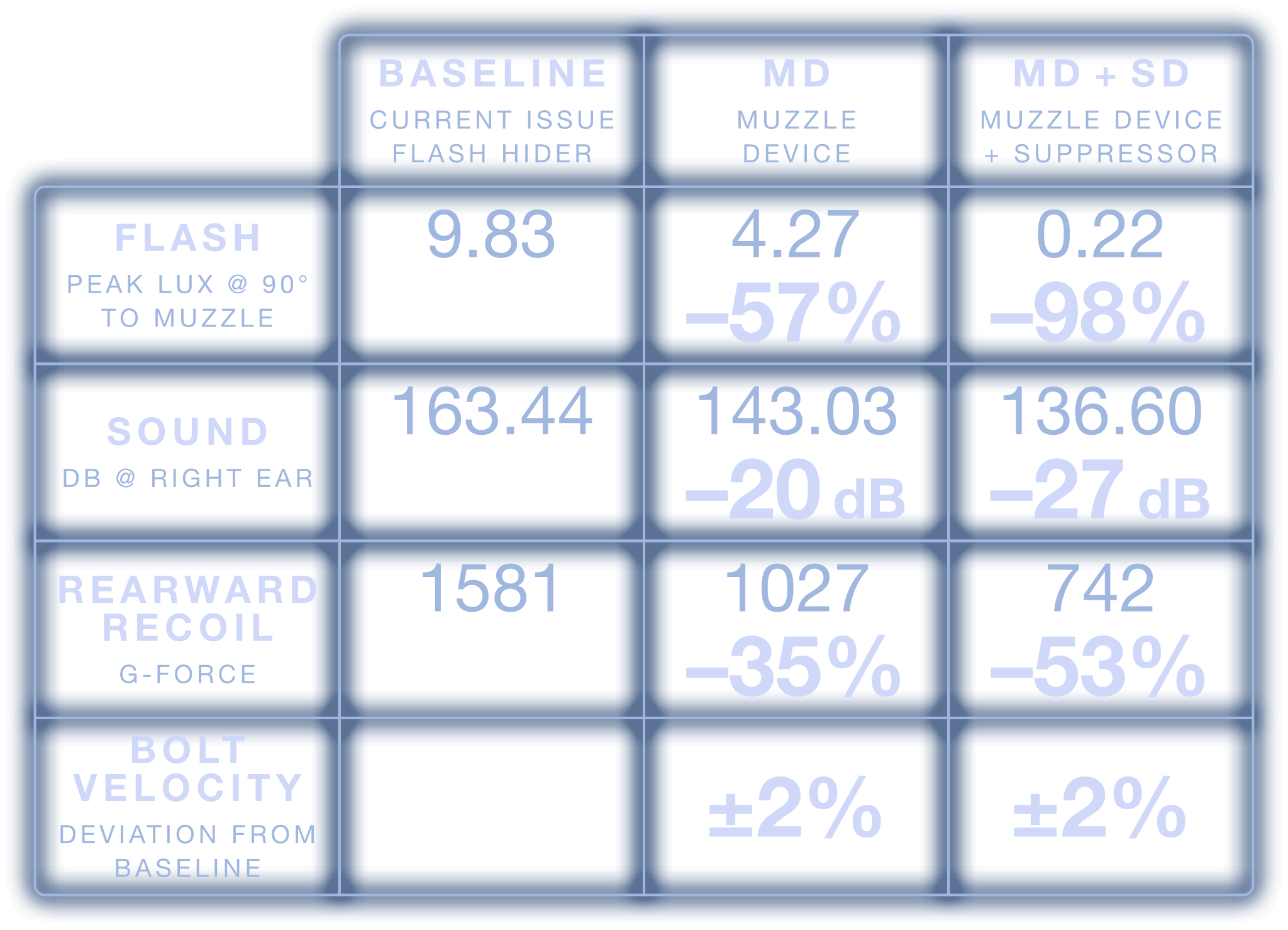 Weapon systems equipped with the MFMD-5.56-0.0-MD-1/2X28 have a bolt velocity change of ±2% when compared to baseline configurations across all firing schedules.