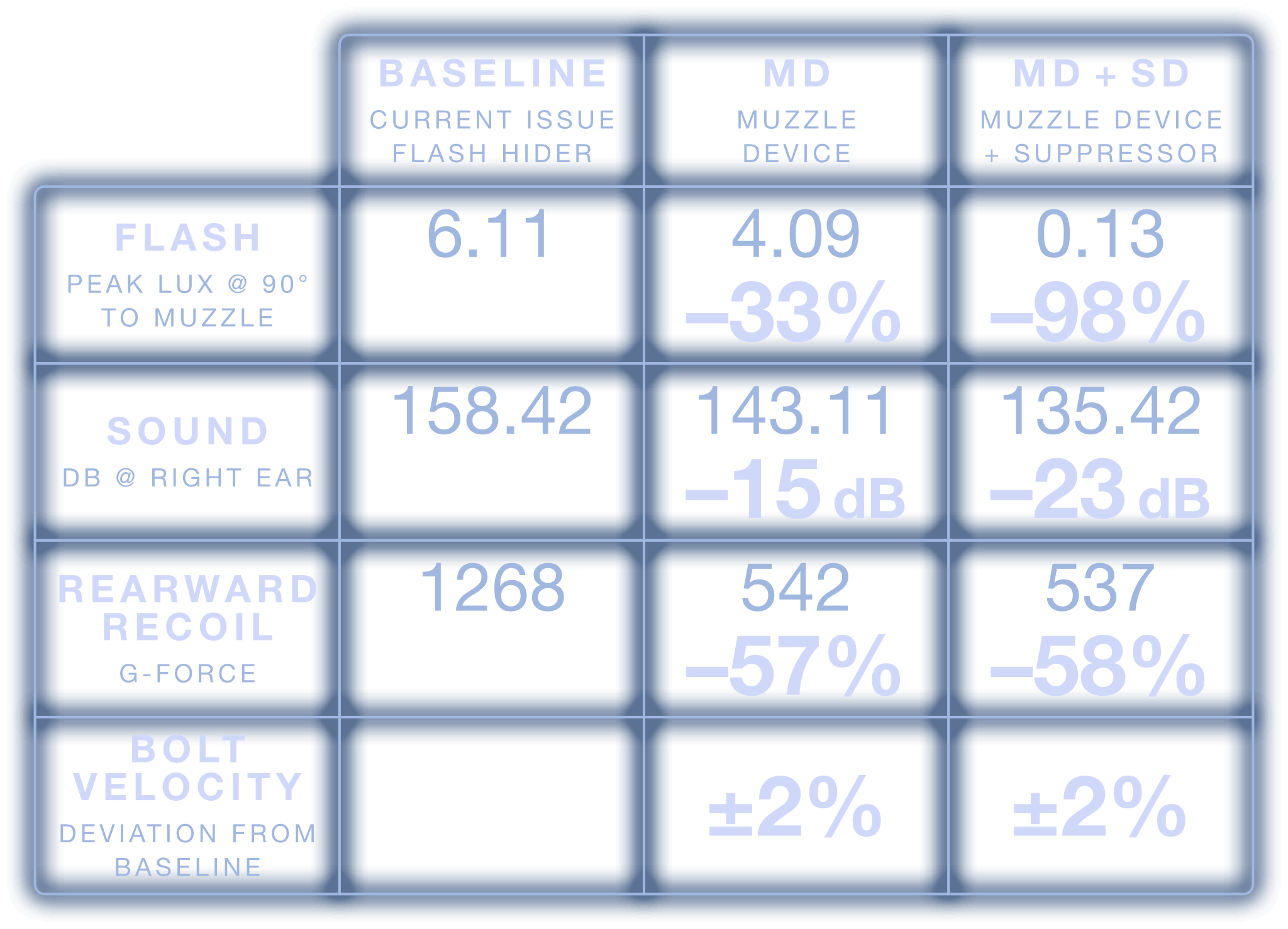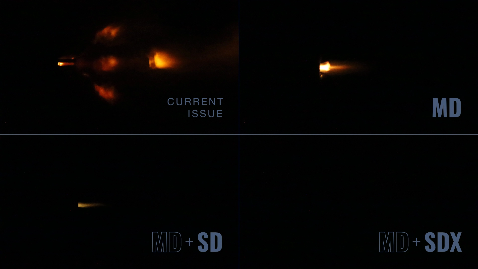 Comparing the visual flash signature of the current issued flash hider versus the MFMD-5.56-0.0-MD-1/2X28 system in each available configuration: MD only, MD+SD, and MD+SDX.