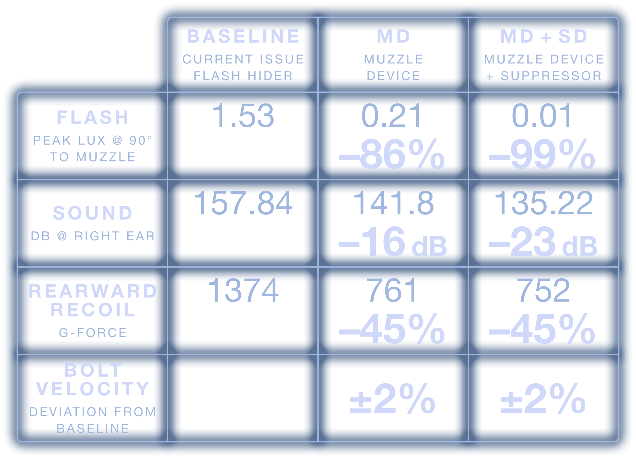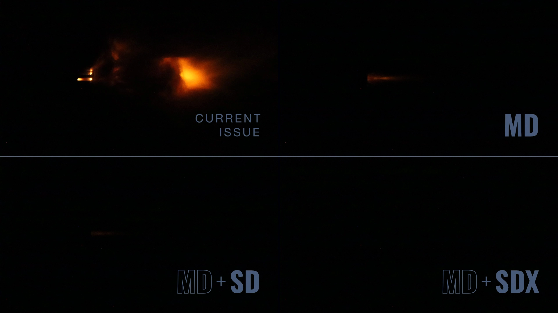 Comparing the visual flash signature of the current issued flash hider versus the MFMD-5.56-1.1-MD-1/2X28 system in each available configuration: MD only, MD+SD, and MD+SDX.