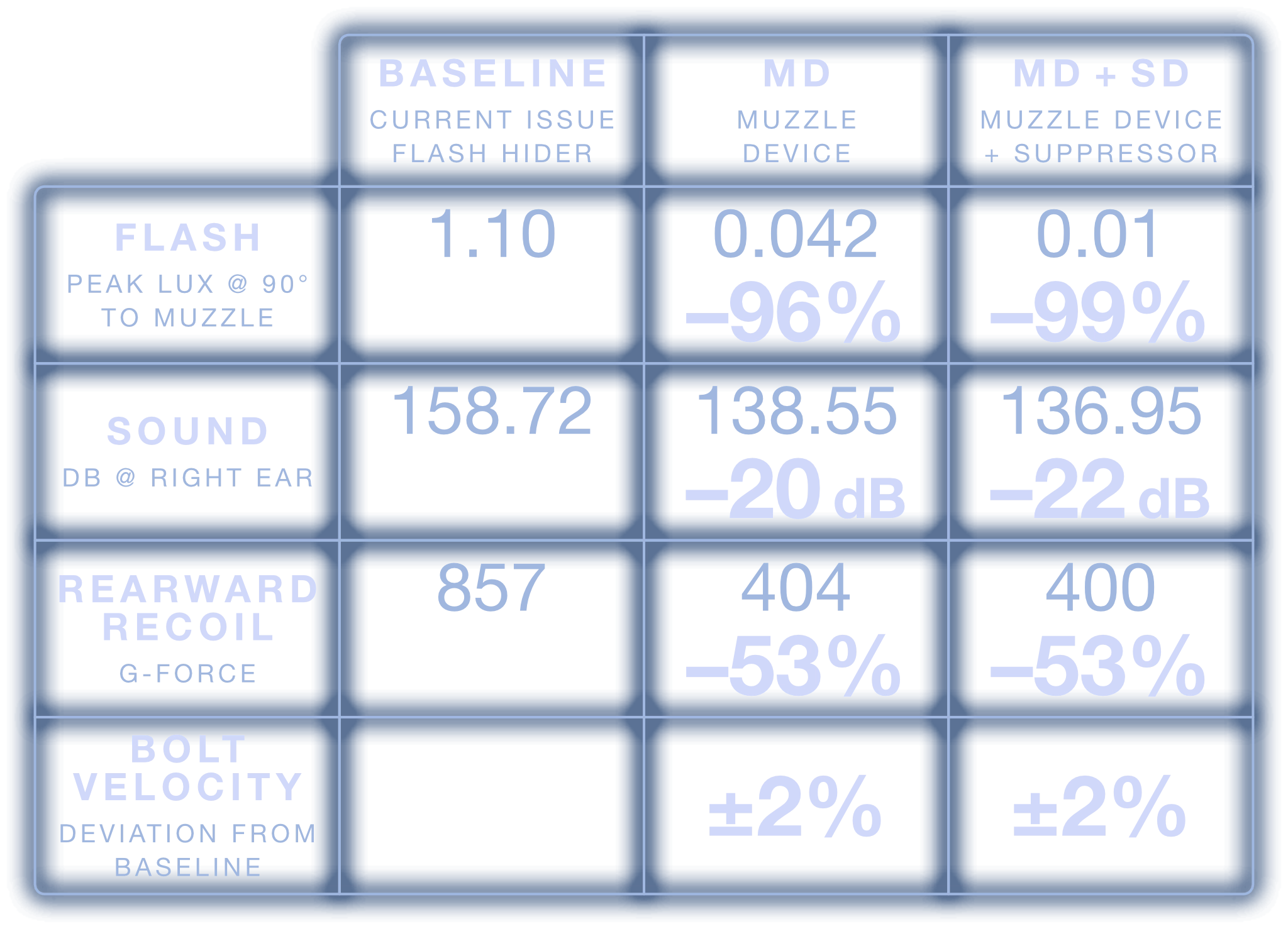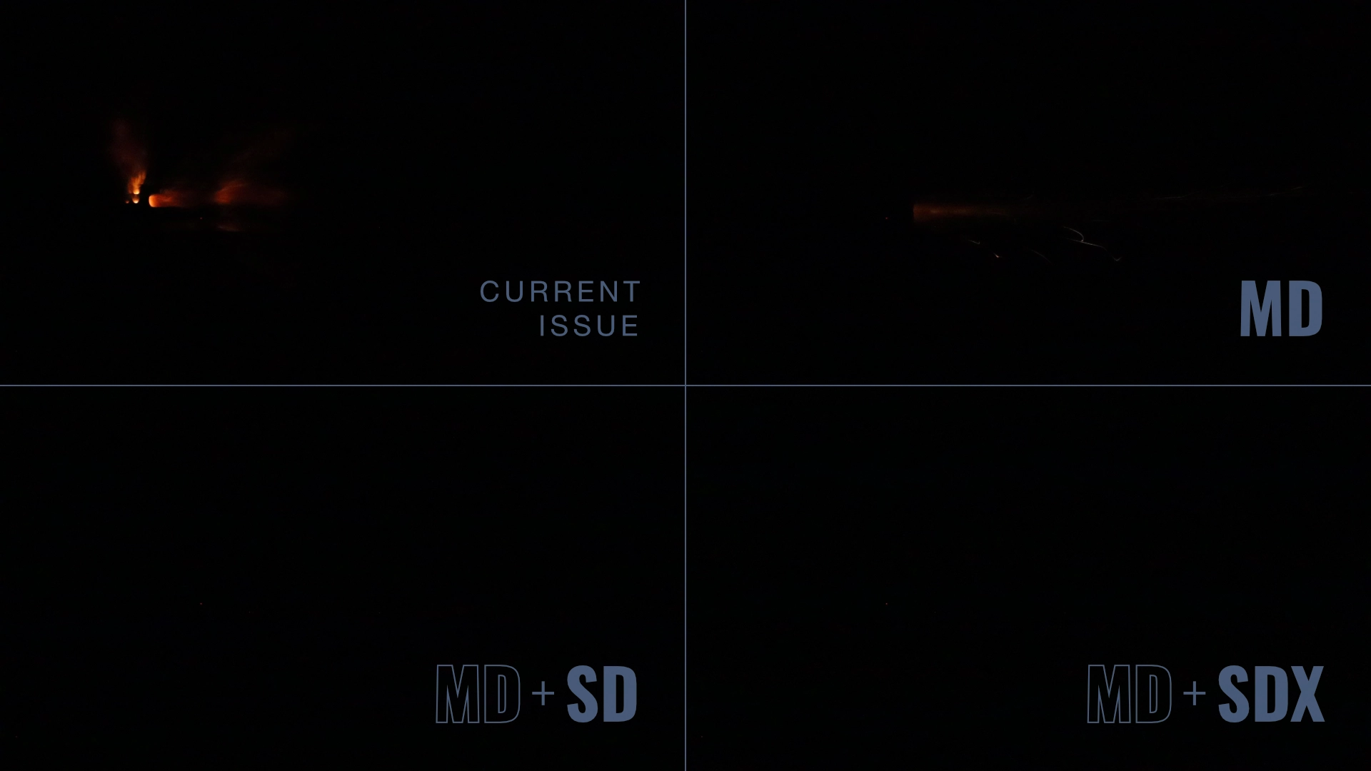 Comparing the visual flash signature of the current issued flash hider versus the MFMD-5.56-1.1-MD-1/2X28 system in each available configuration: MD only, MD+SD, and MD+SDX.