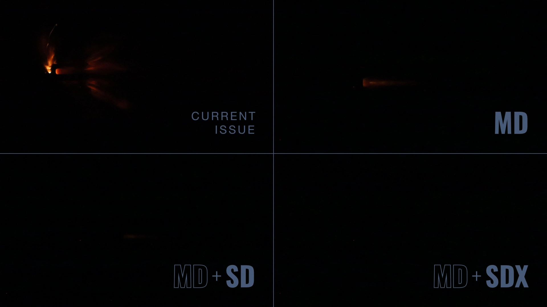 Comparing the visual flash signature of the current issued flash hider versus the MFMD-5.56-1.3-MD-1/2X28 system in each available configuration: MD only, MD+SD, and MD+SDX.