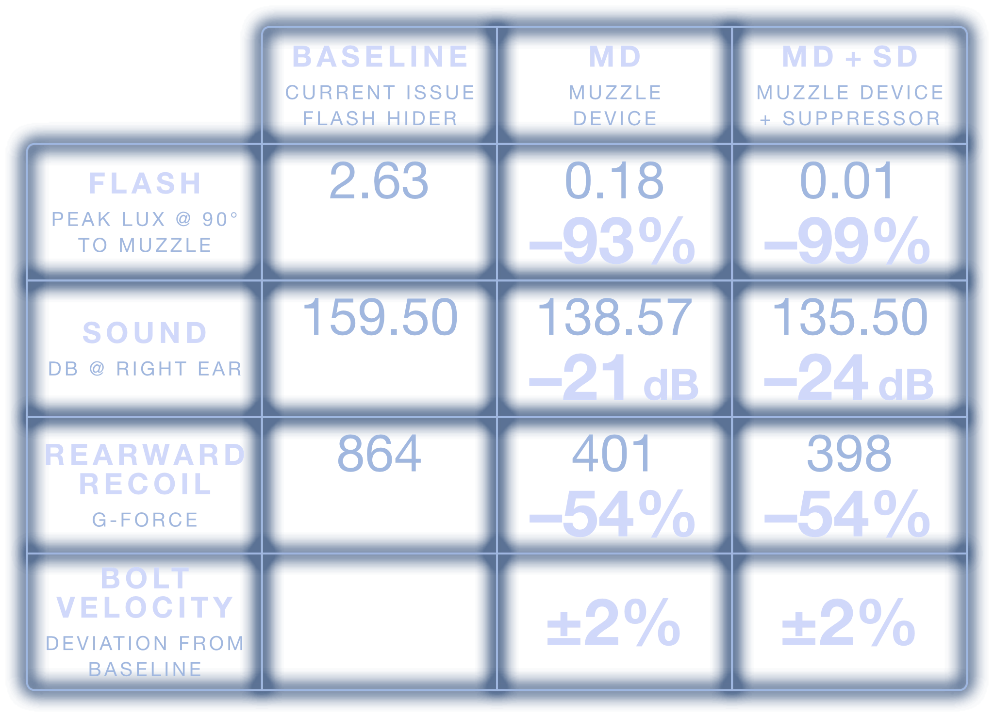 Weapon systems equipped with the MFMD-5.56-1.3-MD-1/2X28 have a bolt velocity change of ±2% when compared to baseline configurations across all firing schedules.
