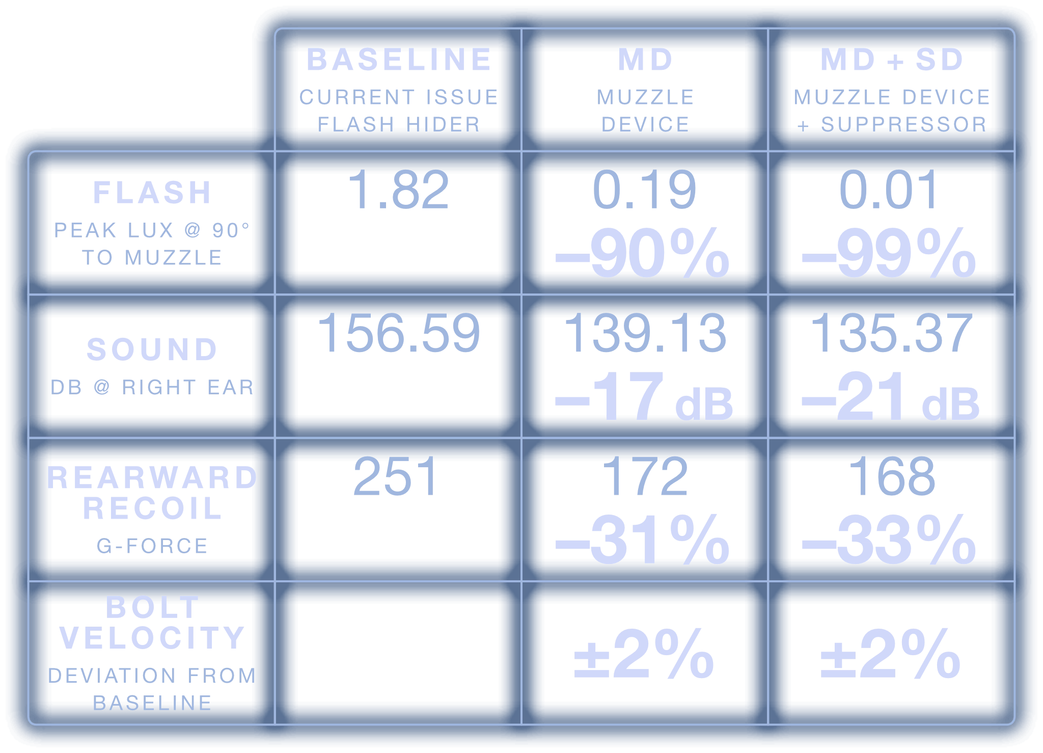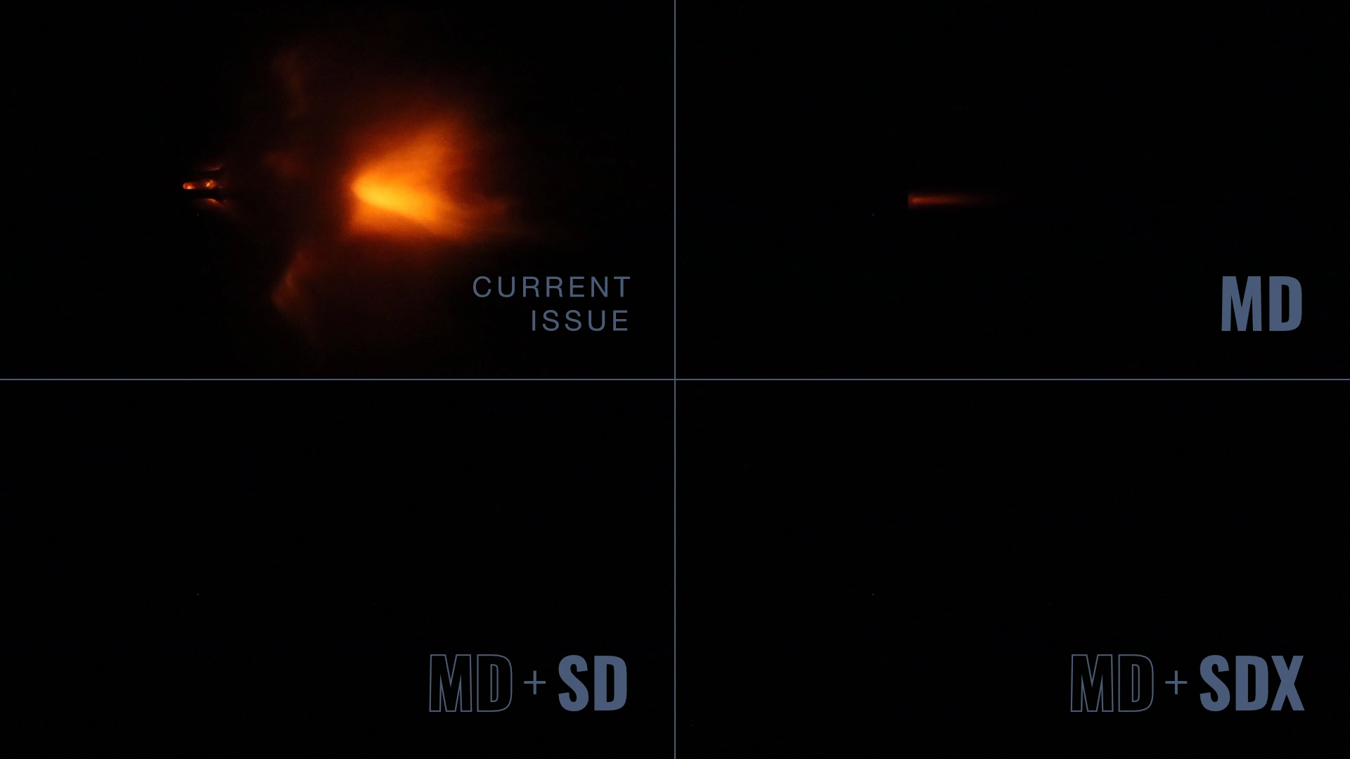 Comparing the visual flash signature of the current issued flash hider versus the MFMD-6.5-1.1 system in each available configuration: MD only, MD+SD, and MD+SDX.