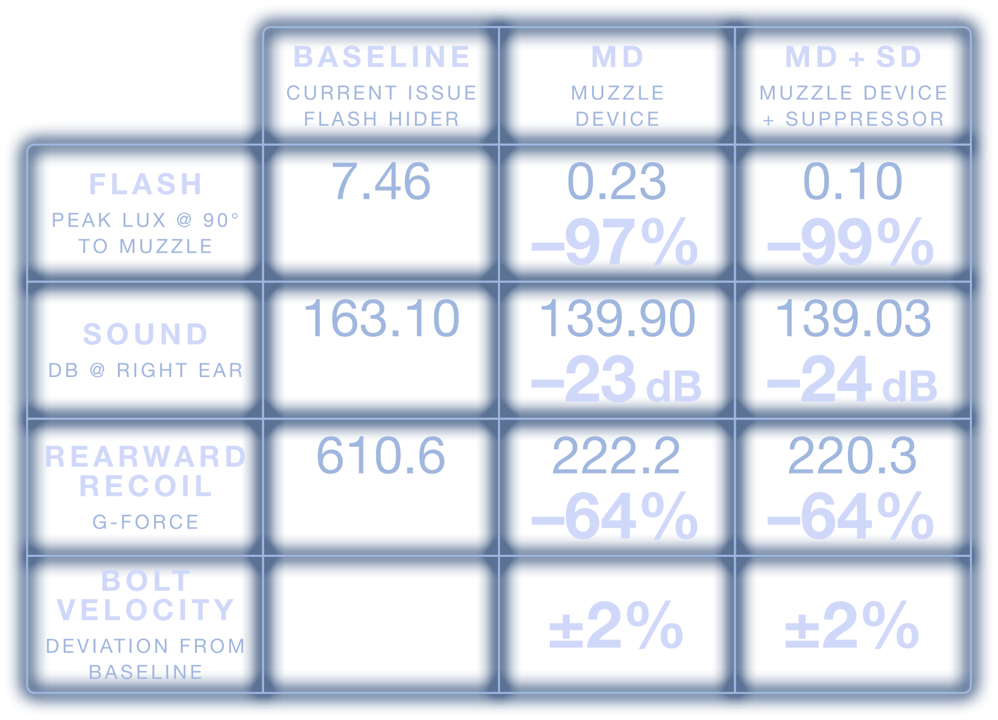 Weapon systems equipped with the MFMD-6.5-2.8-MD-3/4X24C have a bolt velocity change of ±2% when compared to baseline configurations across all firing schedules.