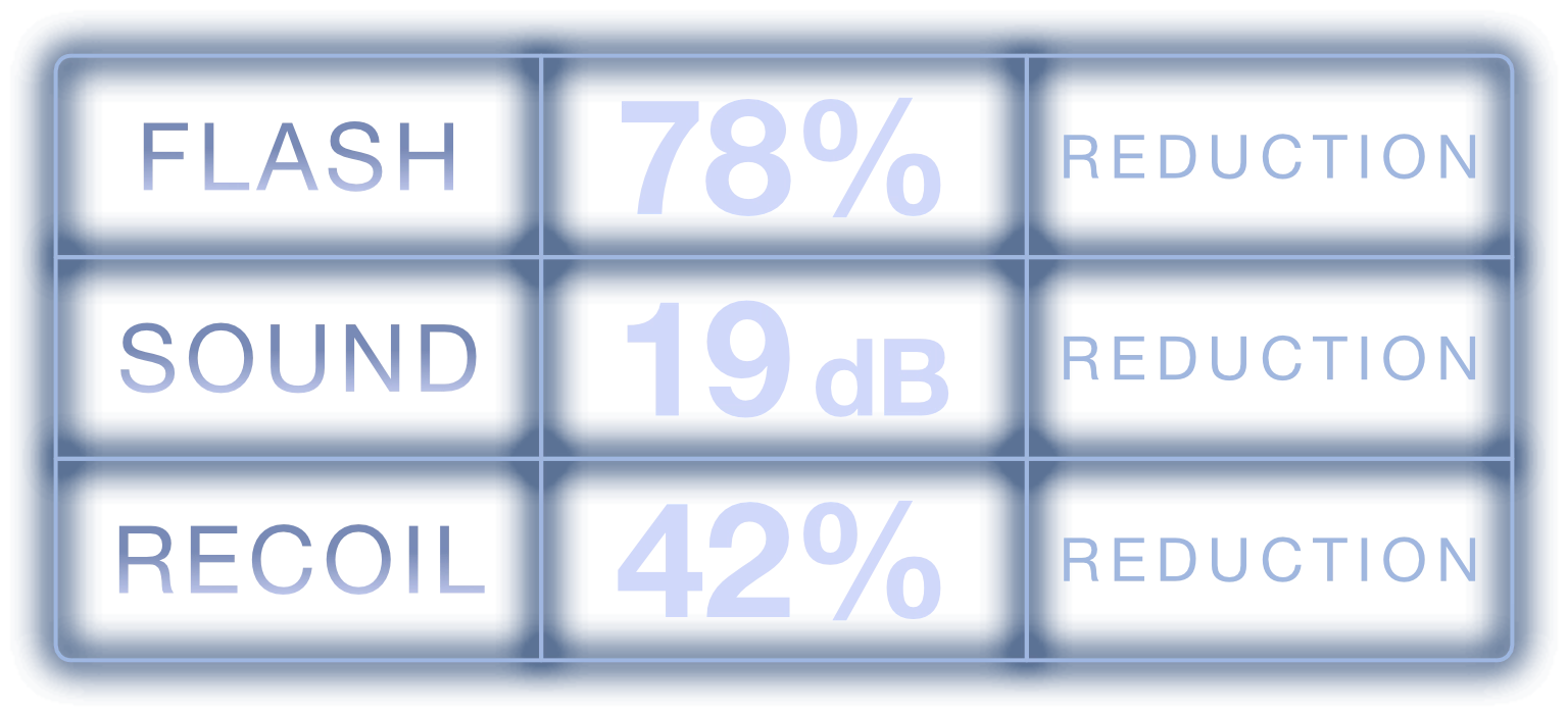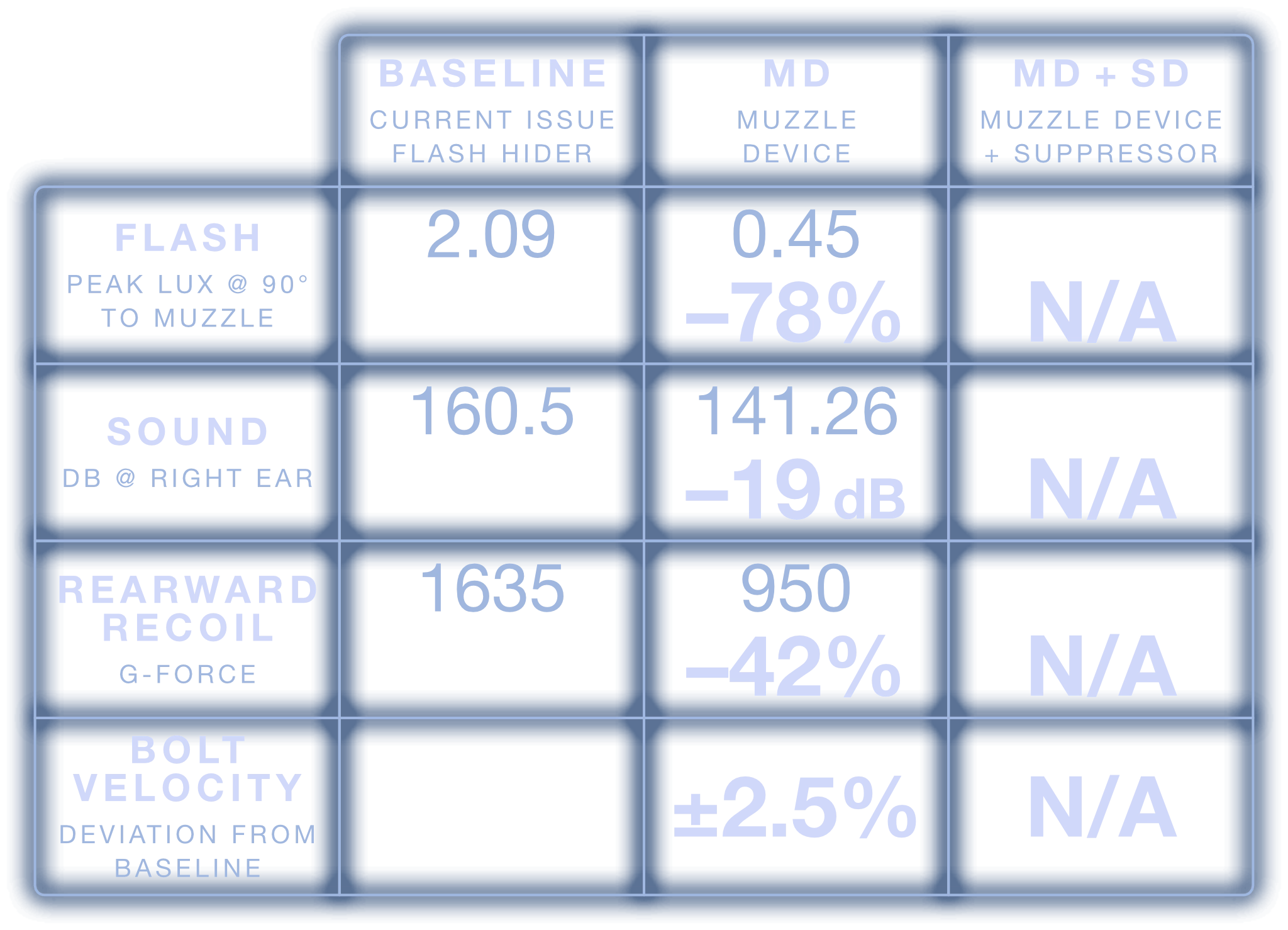 Comparing the visual flash signature of the current issued flash hider versus the MFMD-6.8-2.0MG system in each available configuration: MD only, MD+SD, and MD+SDX.