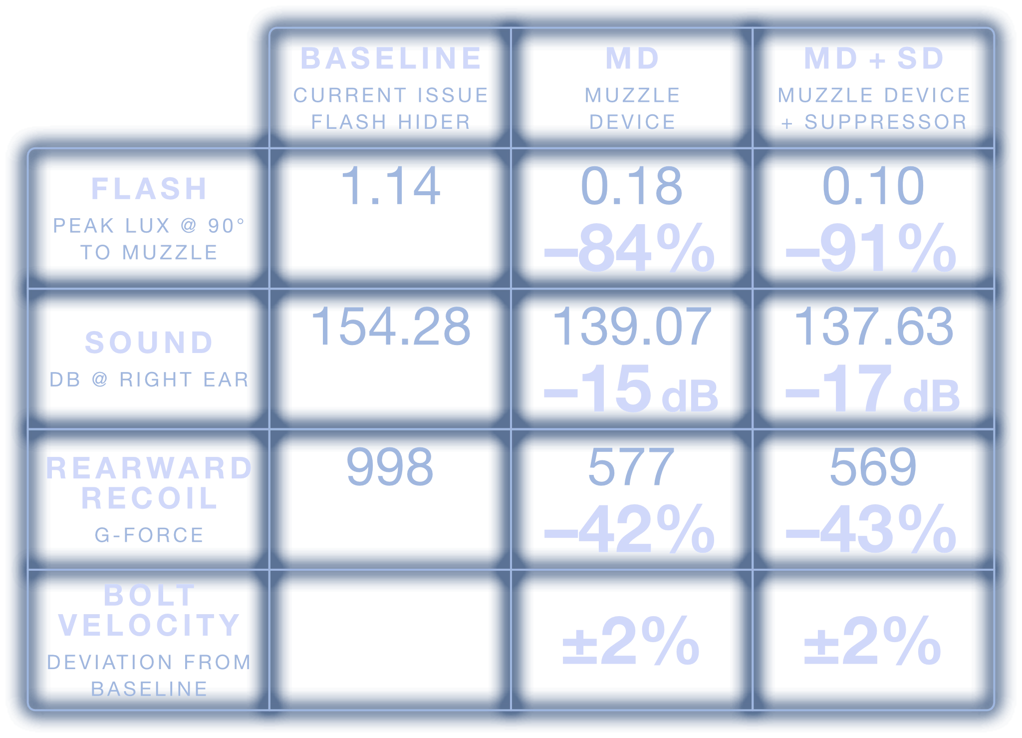 Comparing the visual flash signature of the current issued flash hider versus the MFMD-7.62-4.0-MD-3/4X24C system in each available configuration: MD only, MD+SD, and MD+SDX.
